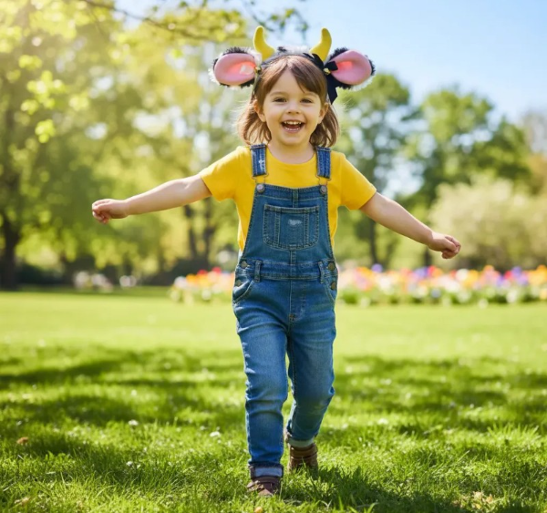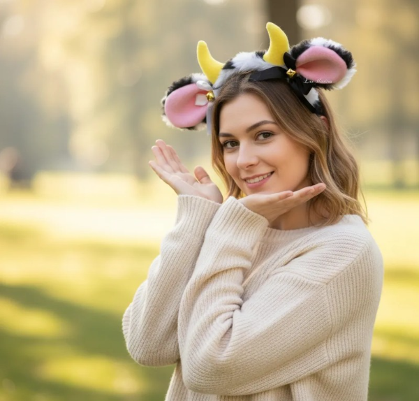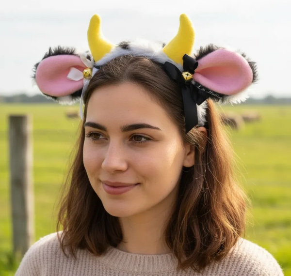 vincha de Vaca en peluche pelo corto. Manchas negras- con cuernitos e interior en polar rosa. El color de Paño puede variar de tono según partida de tela del distribuidor