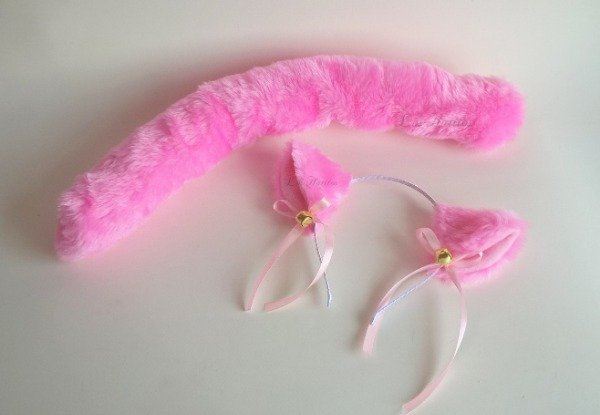 - Orejas de peluche en vincha, con interior en polar , con cascabeles y cintas de raso