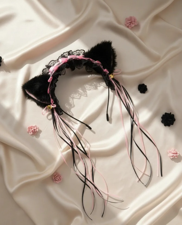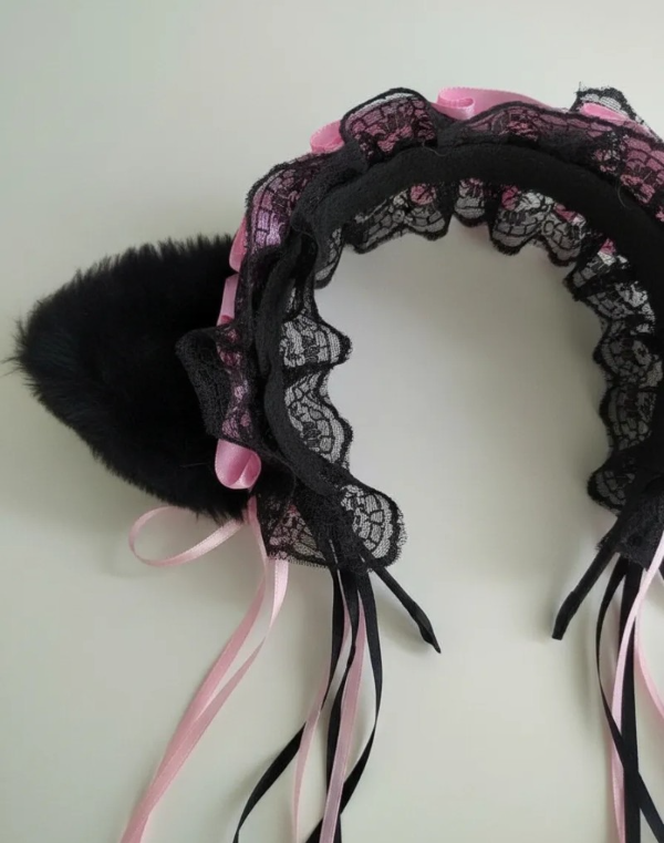 - Orejas en peluche con interior en polar, Cintas de raso y puntilla