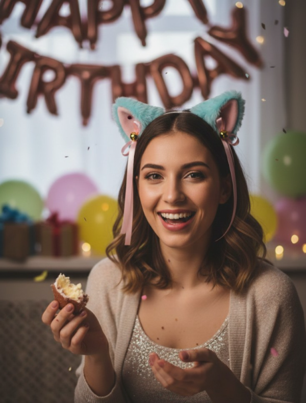 vincha de gato en peluche celeste , interior rosa , con cintas rosas y con vincha de metal forrado